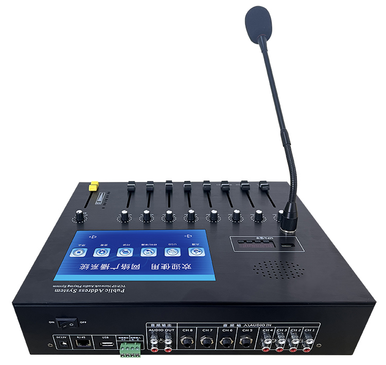 2)1路LAN網(wǎng)絡接口,4路蓮花座外部AUX音頻輸入,4路MIC話筒音頻輸入,4路蓮花座AUX本地輸出,每路音量單獨調節(jié);